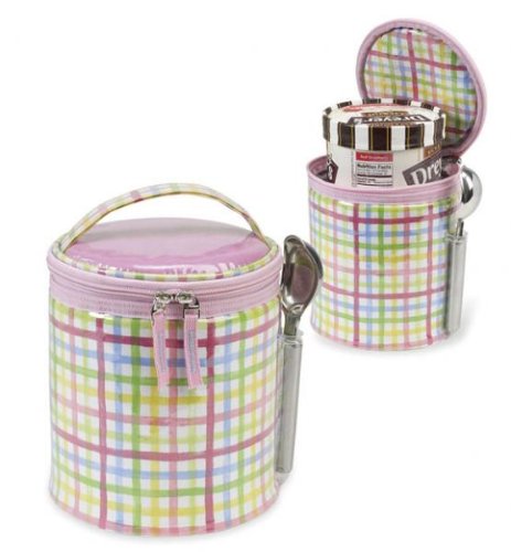 Unique insulated ice cream cooler holds a 1/2 gallon container. Includes scoop. Waterproof easy clean liner.